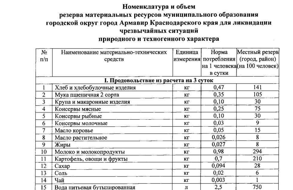 Документ устанавливает строгие нормативы обеспечения одного человека в сутки в условиях ЧС. Также прописан резерв из расчета на 100 человек. Согласно постановлению, продовольственный запас должен включать хлеб, муку, крупы и макаронные изделия, а также всевозможные консервы. Также резервируется масло, молоко, картофель, овощи и фрукты, сахар, соль, чай и питьевая вода.